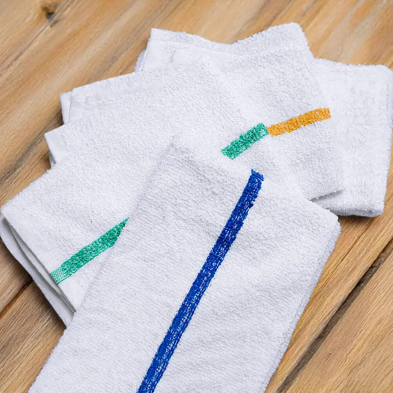 These cloths are available in five different colors: simple white, single blue stripe, single green stripe, single golden stripe, and a double stripe (golden & blue). The variety of colors allows businesses to use color coding for different cleaning tasks, ensuring efficiency and organization.