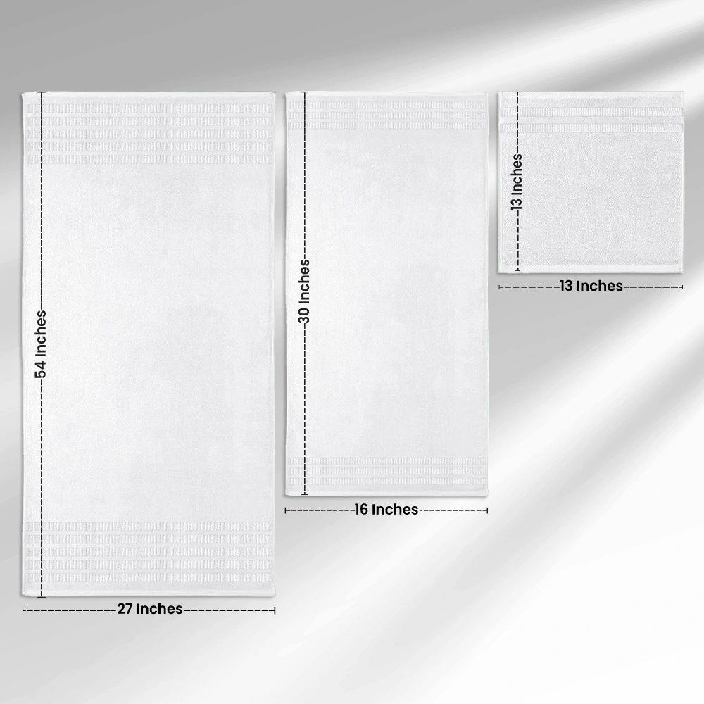 The Ultra Luxury White Towel Set includes bath towels (27” x 54”), hand towels (16” x 30”), and face towels (13” x 13”). Each towel is finished with decorative hems and reinforced edges. This extends the towel’s useful life by 50%, providing a long-lasting luxury experience.