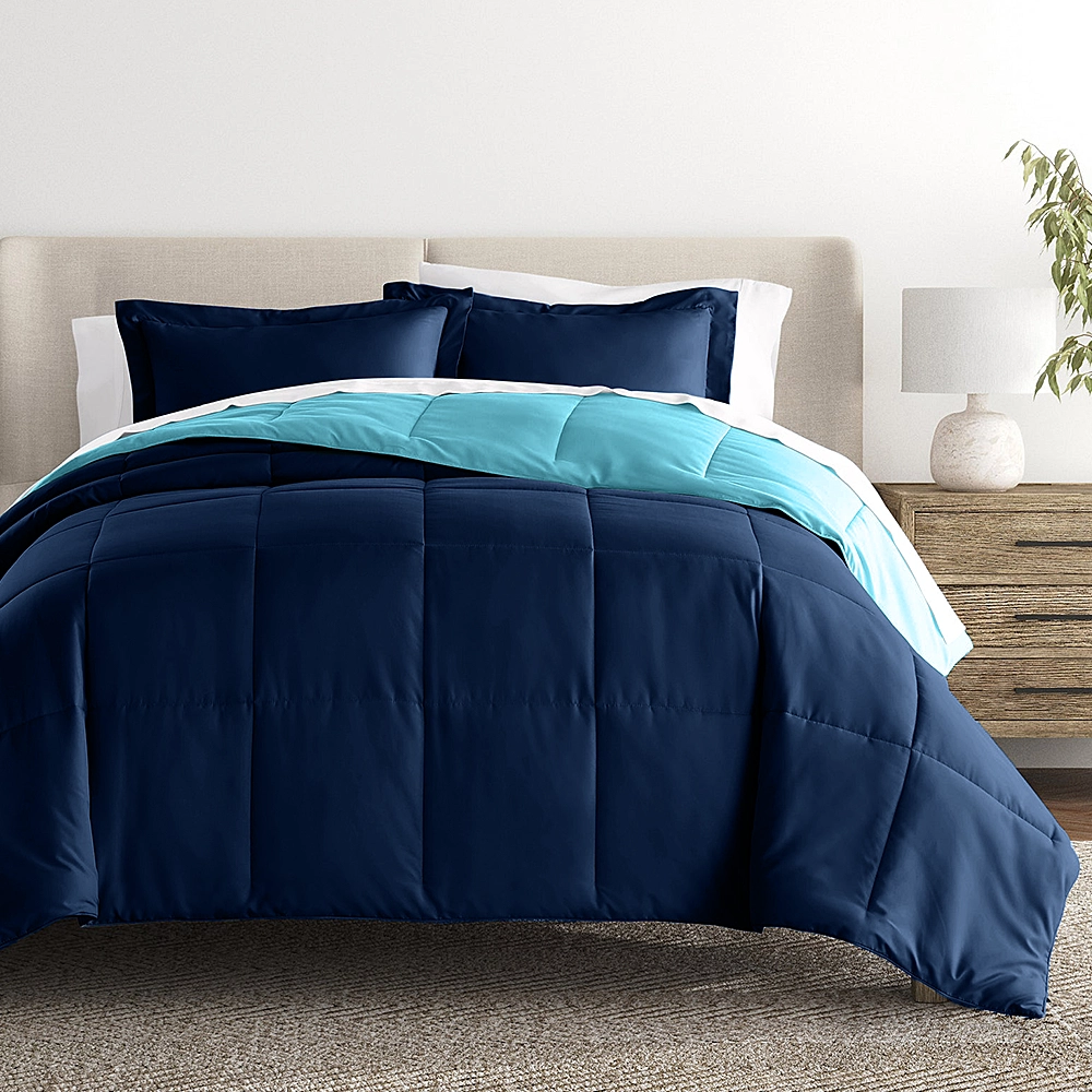 This reversible comforter offers a sleek navy blue side and a calming light blue side, bringing a refreshing and versatile touch to hotels, resorts, and homes.