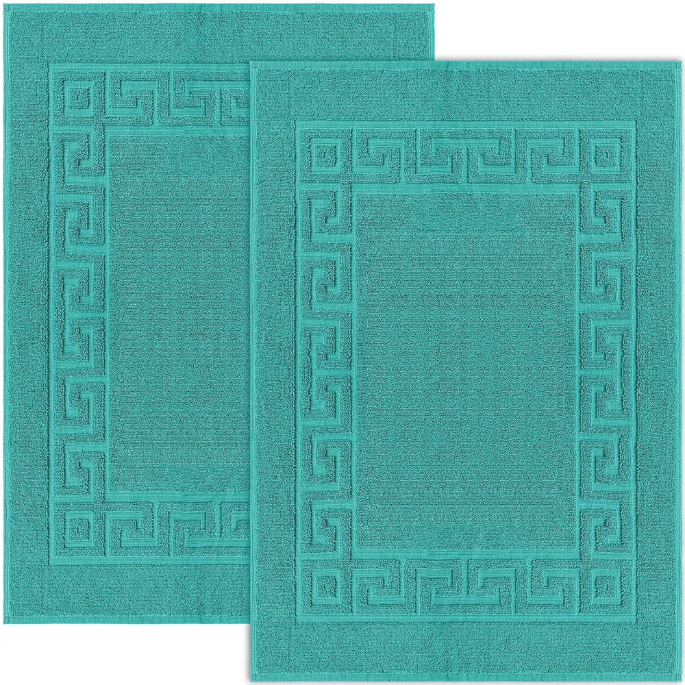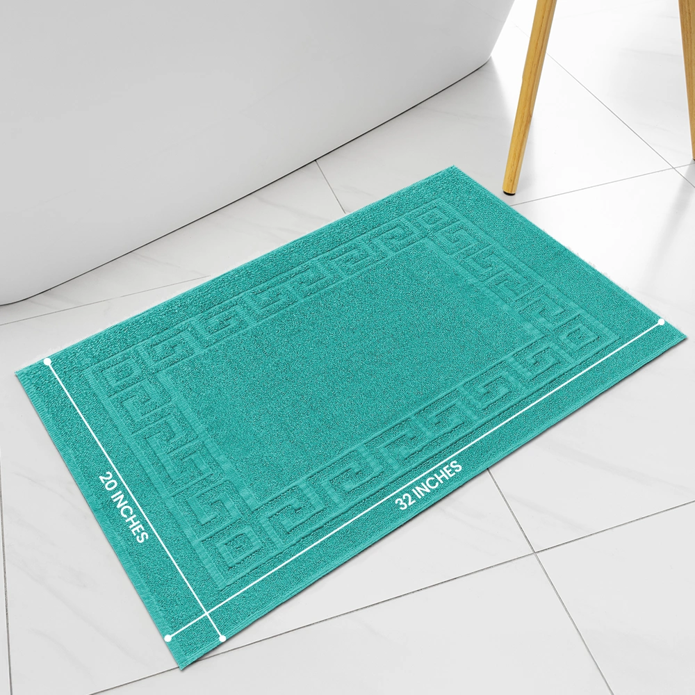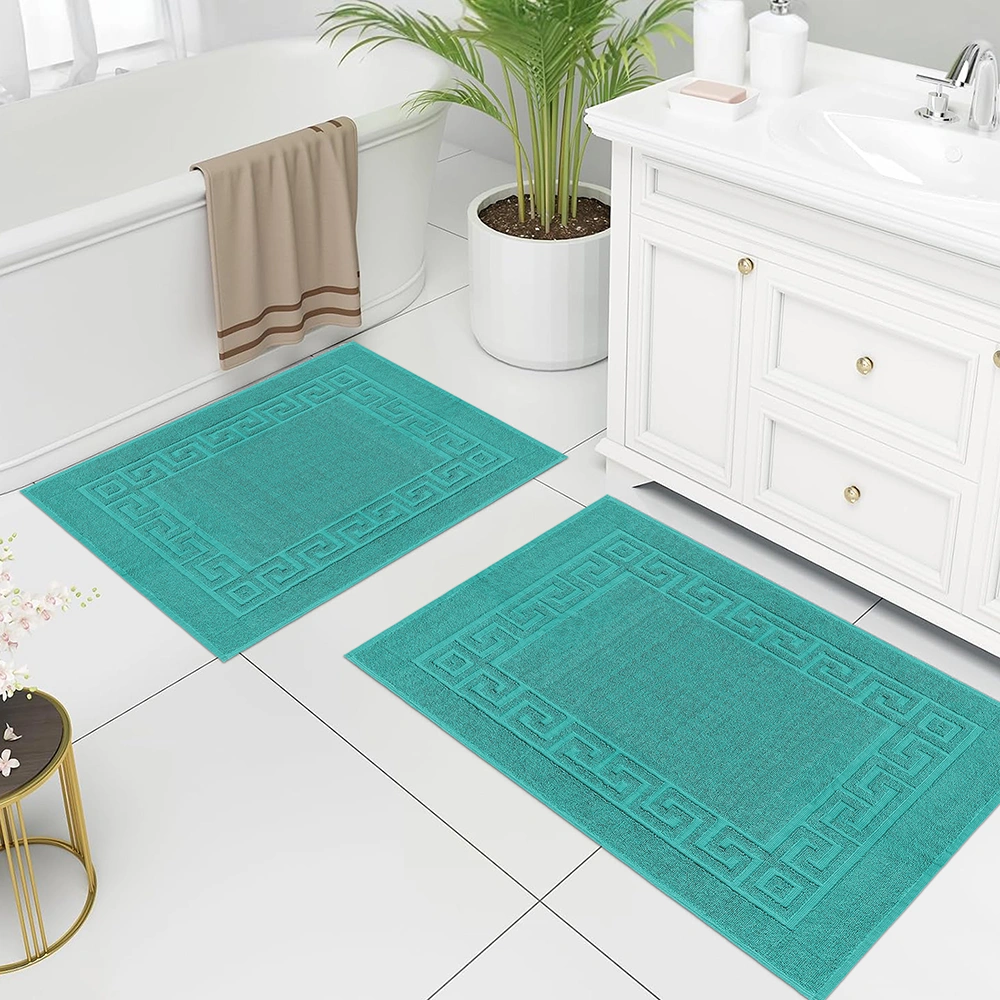 Available in navy blue, black, light grey, dark grey, sage green, beige, teal, hunter green, and white, these mats add a pop of color to your bathroom. The Greek key border design adds a luxurious touch. Decorative hems enhance their durability, making them ideal for long-term use.